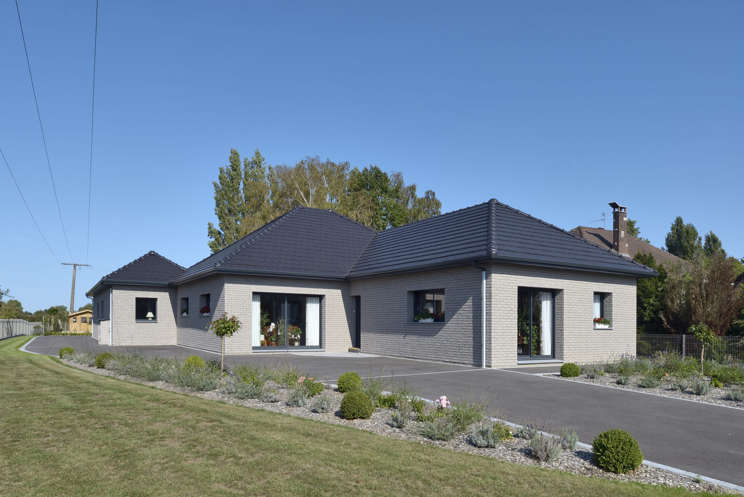 Maison de plain-pied de 156,69 m² habitables, offrant confort et fonctionnalité. La façade en briques moulées main ton gris “Platina” (Vandersanden) s’associe à des menuiseries aluminium gris anthracite et des volets roulants aluminium pour un rendu élégant et contemporain. La toiture en tuiles terre cuite...