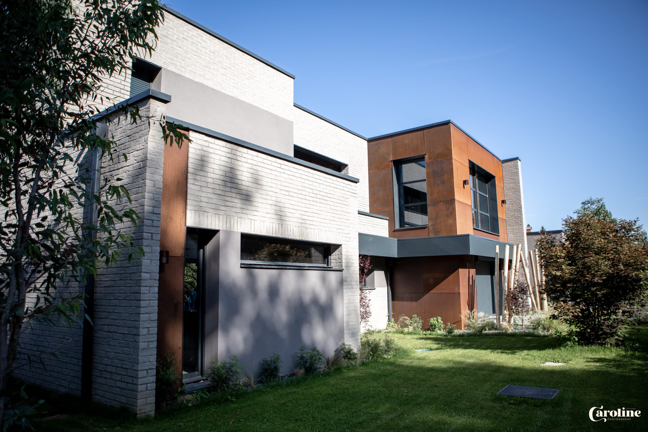 Découvrez une maison contemporaine à l’architecture affirmée, mêlant briques claires et enduit gris pour un contraste élégant et moderne. La façade est sublimée par un bardage en acier Corten effet rouille, apportant caractère et chaleur à l’ensemble....