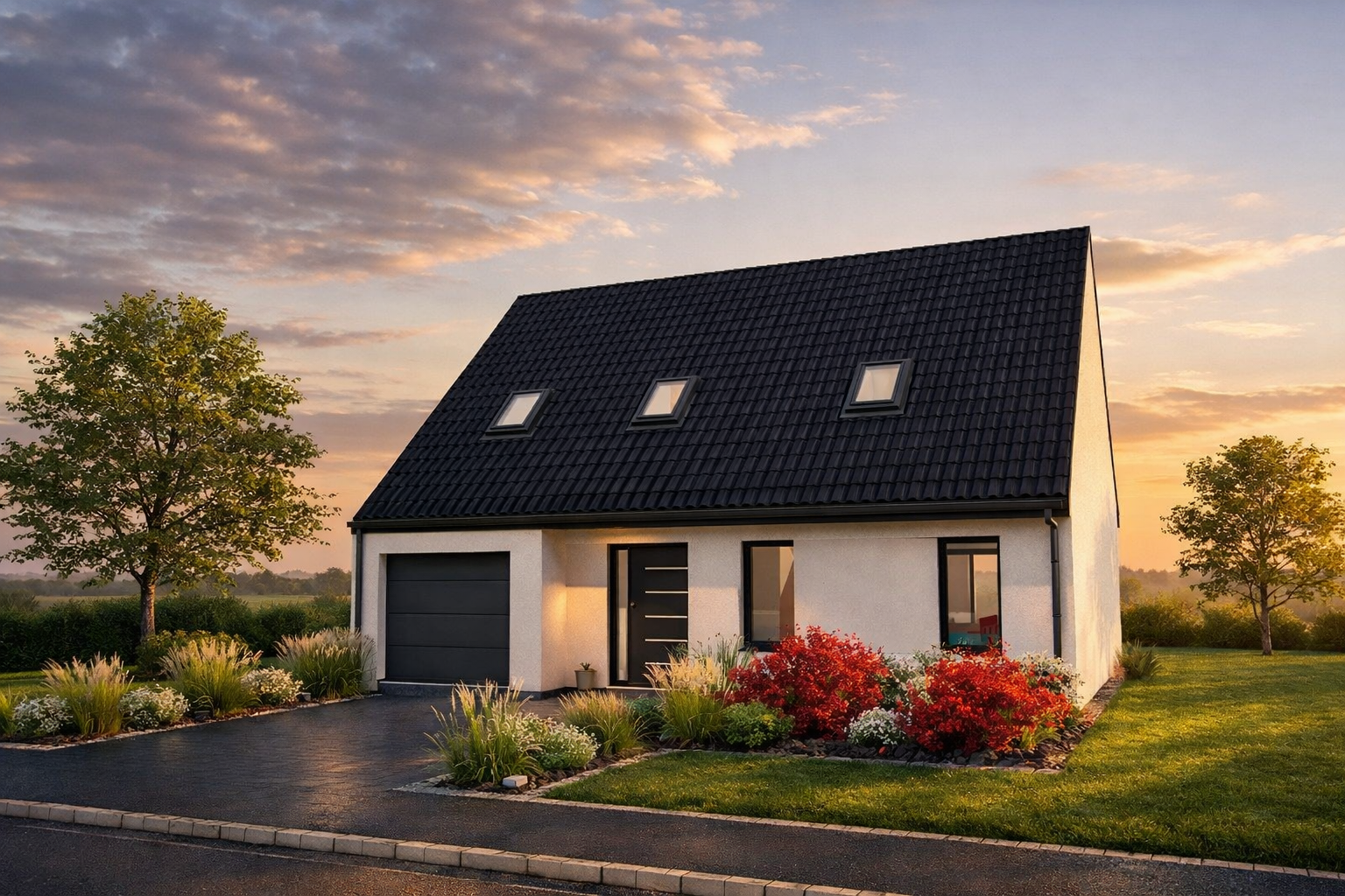 Ce modèle avec garage intégré propose un aménagement fonctionnel avec chambres aménagées en combles, offrant un bel équilibre entre espace de vie au rez-de-chaussée et coin nuit à l’étage.