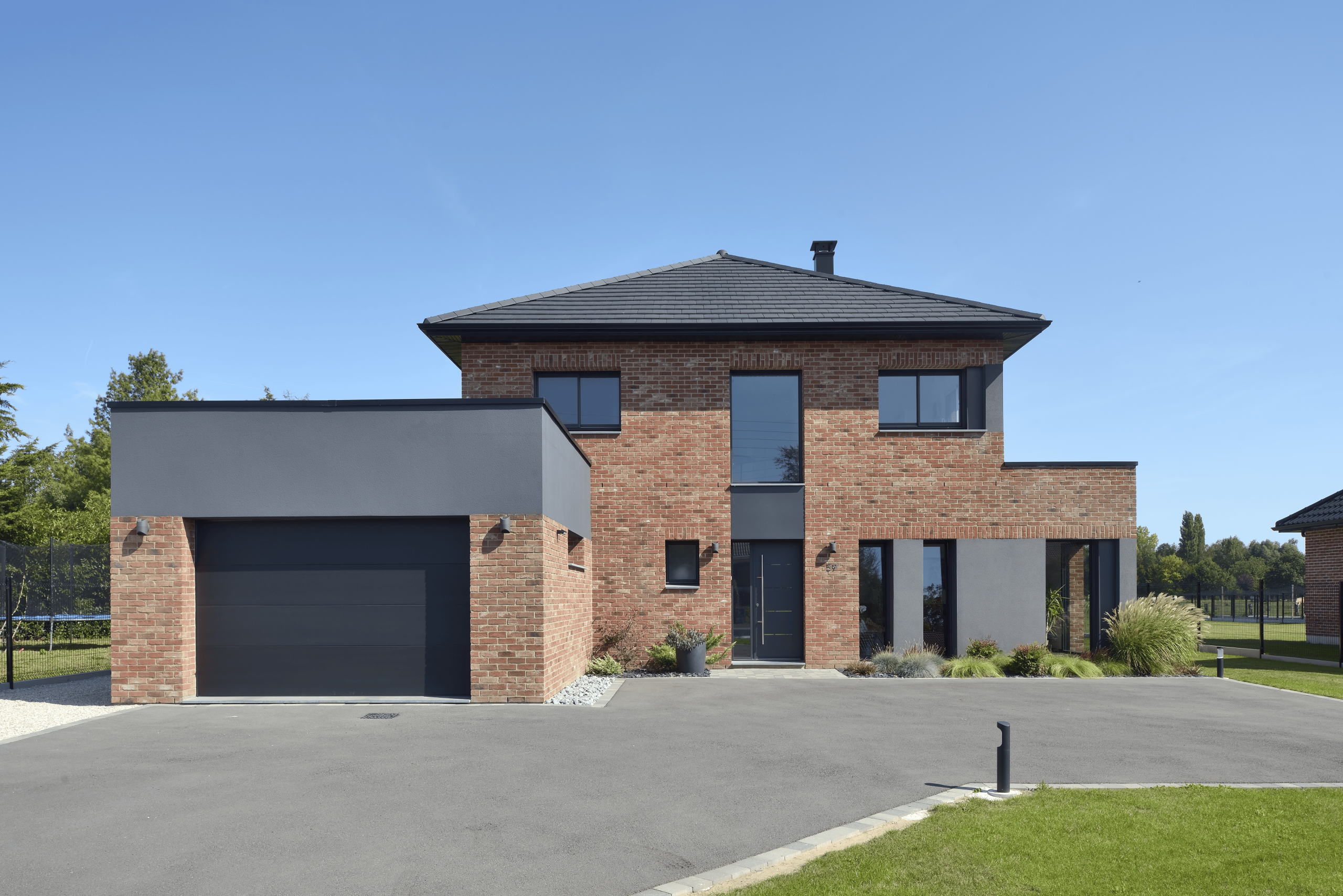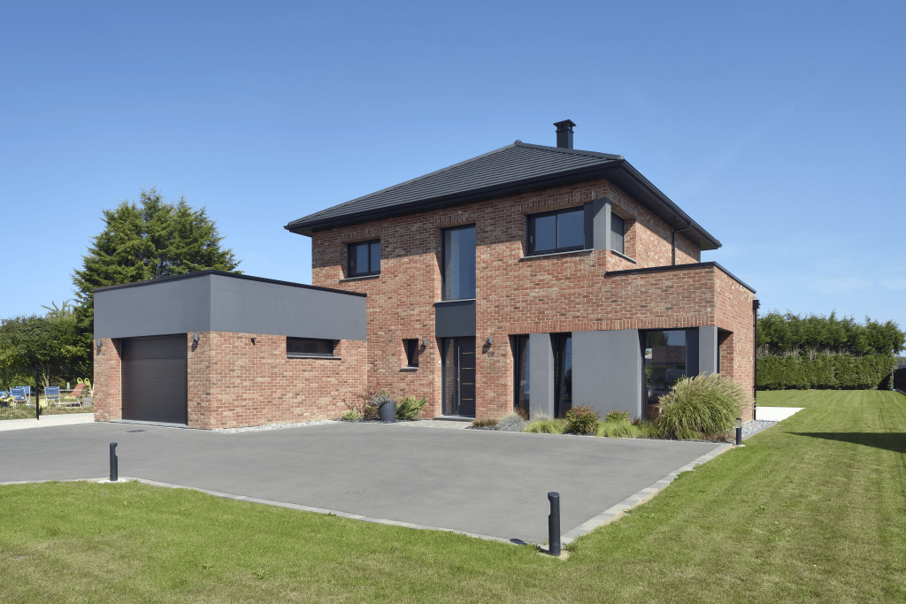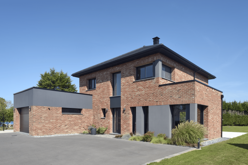Maison contemporaine de 151,88 m² habitables, offrant des espaces de vie lumineux et fonctionnels. La façade associe briques moulées main ton rouge et enduit gris foncé, pour un style moderne et élégant. Les menuiseries aluminium noires, les volets roulants blancs et la toiture en tuiles minérales grand moule noires renforcent le caractère de l’ensemble. Une habitation familiale alliant esthétisme, confort et durabilité.