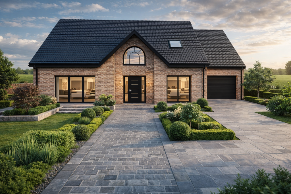 Une superbe inspiration à combles en briques, avec de grandes fenêtres et une entrée centrale soignée.