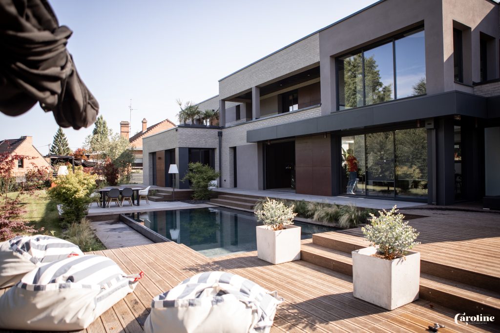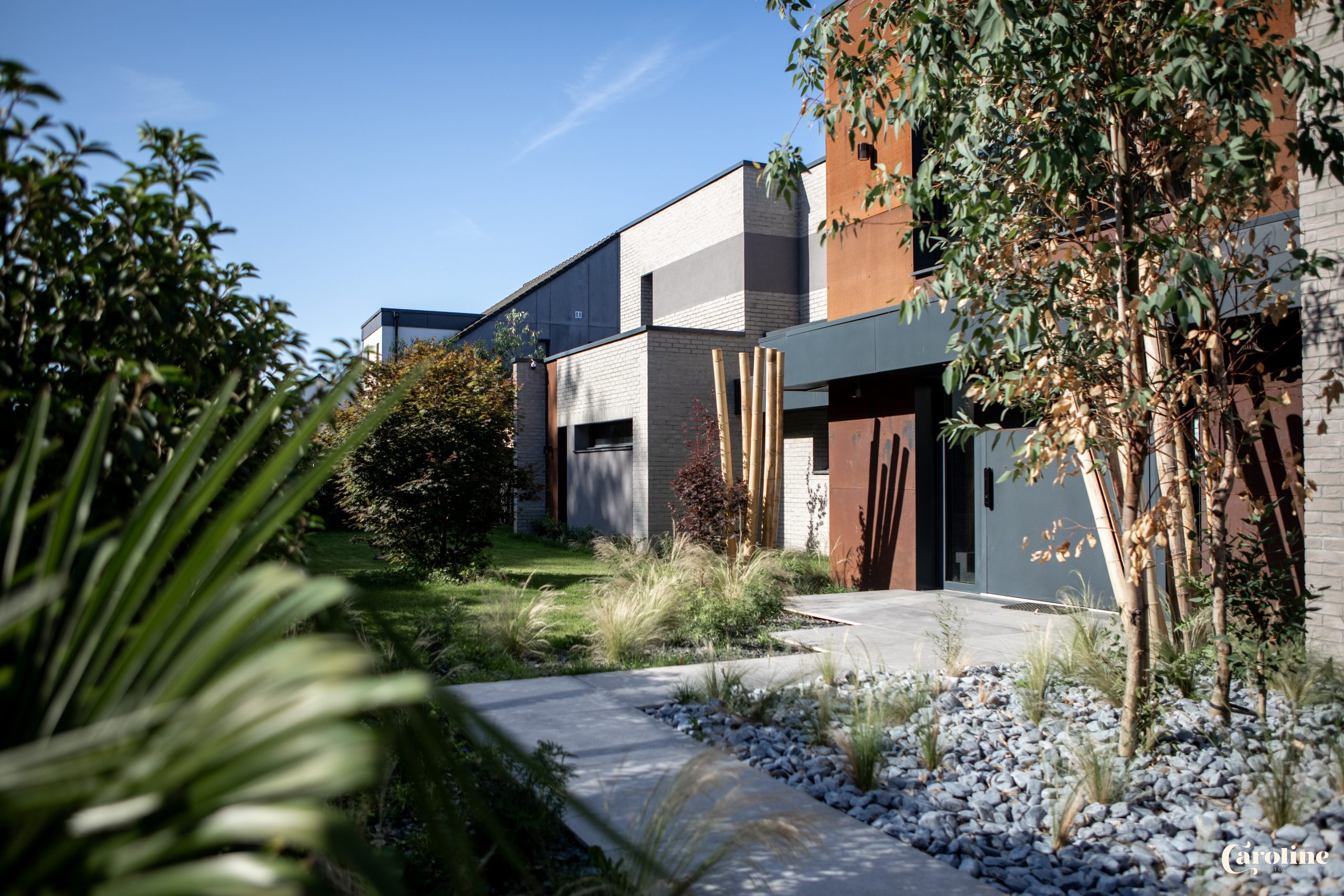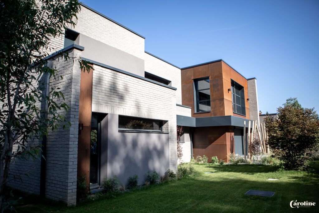 Découvrez une maison contemporaine à Mérignies, mêlant briques claires et enduit gris pour un contraste élégant et moderne. La façade est sublimée par un bardage en acier Corten effet rouille, apportant caractère et chaleur à l’ensemble.